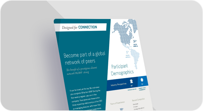 Designed for CONNECTION 32% north america ecome part of a global 5% south netor of peers america The benefit of a prestigious alumni Participant + network 98,000 strong Demographics ‡t can be lonely at the top ”ut not „hen ndustry Perspecti…es ˜ ˜ you co†plete Wharton œuring the –— 1™ fiveŒ„ee‰ progra†, you are in fine financial services manufacturing co†pany žour peers are those „ithin & engineering three reporting relationships of the CŸ¡ or †anaging director, „ith †ore than ‰ears of „perience €ecent ompanies 2 years of †anage†ent e‚perience ccenture % ma‰on Together, along „ith faculty, coaches, 39 nbang —nternational and e‚ecutive †entors, they 31% ƒanco ƒradesco beco†e part of your e‚ecutive ƒŽ aribas net„or‰ These are relationships ƒ that can last a lifeti†e and even ˆocaˆola —ndia 17% ˆredit Suisse provide a lifeline „hen you’re % ¢.. organ facing tough situations 13 itsui § ˆo. Žike Žippon •ife —nsurance ˆompany hilips ›oche Saudi ramco Standard ƒank ¨urich —nsurance €roup < 20 20–25 25–30 30+ 10 wharton advanced management program